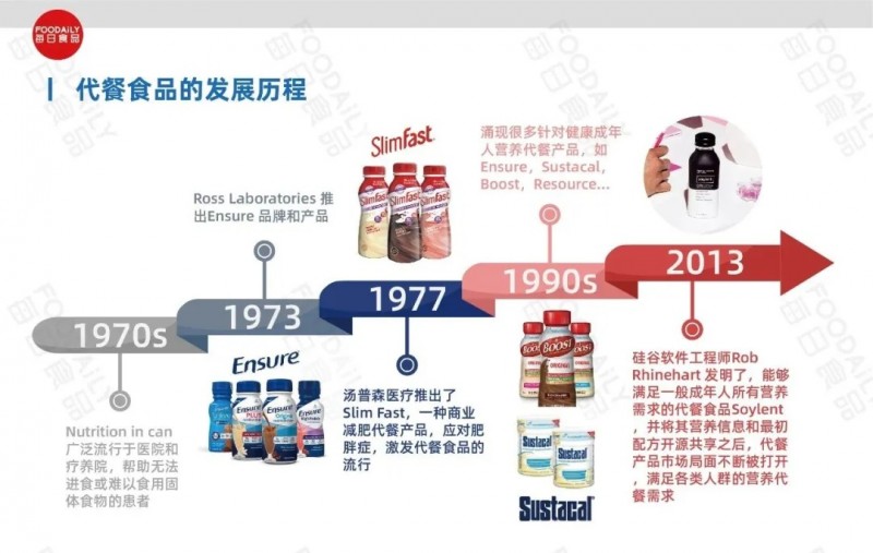 代餐作为一种舶来品,Foodaily观察到其在欧美的成长路径大致是:从特殊医疗食品到运动营养&体重管理功能性食品,再到大众营养代餐食品。