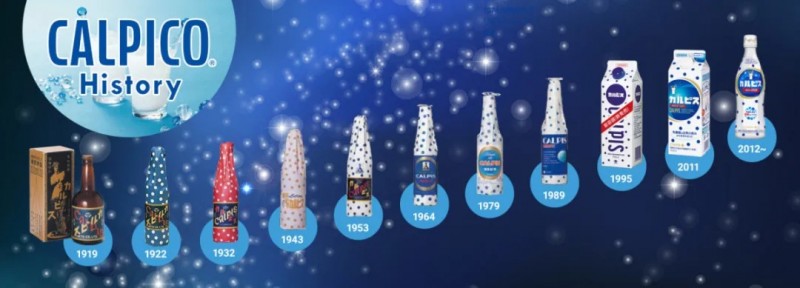 1922年是可尔必思早期发展中的重要一年。这一年,三岛海云在营销上接连发力,不仅对可尔必思的包装改头换面,确立了瓶身蓝白相间的波尔卡圆点设计,也首次以“初恋的味道”为口号开始推广。为了呼应产品上市的7月7日,瓶身放弃了此前的棕色玻璃瓶包装,转而采用蓝色背景加上白色圆点的设计,来象征银河系中的群星。此后,产品包装虽历经更迭,但寄托了银河浪漫想象的波尔卡圆点和蓝白配色却始终不变。