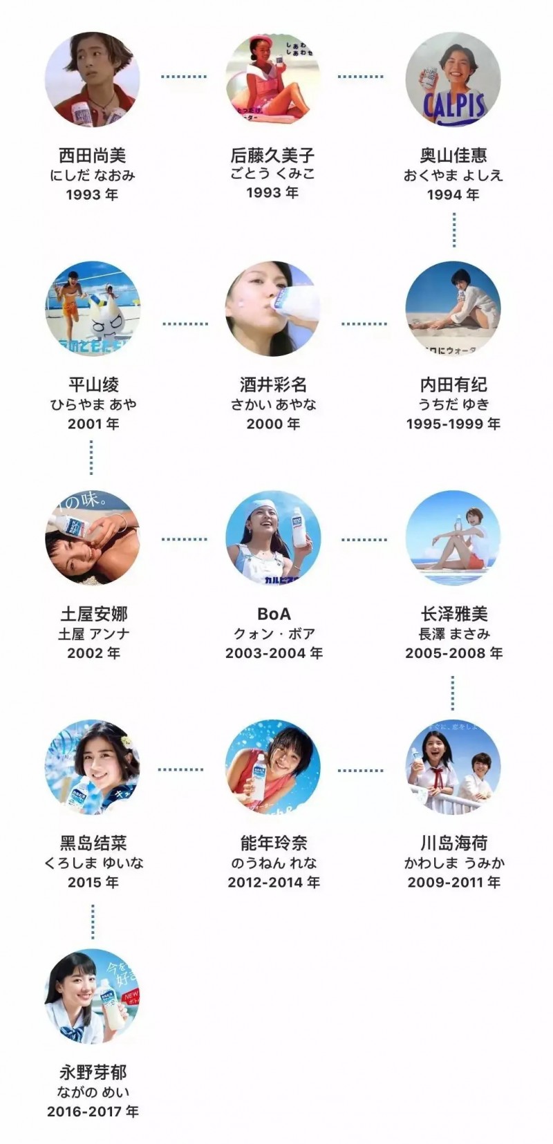 与健康转型同期推进的,是延续了近30年的“可尔必思女孩”攻势。自初代西田尚美开始,可尔必思在一年又一年的广告中,不断挑选正当红或者极具潜质的年轻女孩作为代言人,场景大多设置在炎夏的校园、海边等。这些女孩多有着一张“初恋脸”,弯眉眼与开朗笑的感染力极强,为大众共造一场不落幕的“少女梦”。