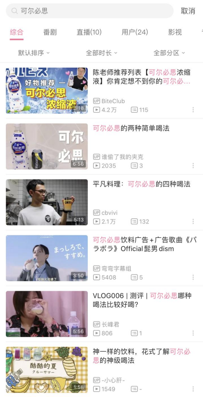 可尔必思的另一个营销关键词,套用时下的营销术语,就是UGC带货。打开任何社交网站或视频网站,搜索可尔必思,以其为原料制作花式饮品都是长盛不衰的主题。由于其酸甜可口,口味上的可能性极其丰富,与乳品、水果、酒类搭配,或者入甜品皆可。正如可尔必思官微介绍的那样,“每个人可以根据自己的喜好调制出不同口味的饮品”。尽管官方偶尔会推出一些DIY指南,但往往更有号召力的,还是各路美食达人的私房食谱。