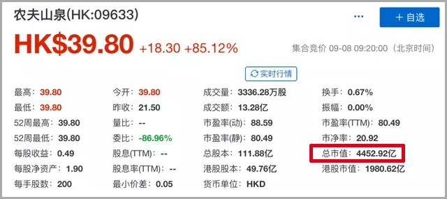 不负众望!9月8日,农夫山泉登陆港股上市首日便高开,报39.8港元/股,涨幅为85.12%,总市值达4452.92亿港元,相当于2.5个蒙牛、1.5个伊利或近5个康师傅。