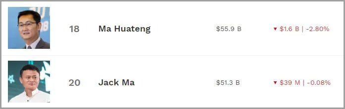 根据福布斯实时富豪榜数据,排名前三的中国富豪分别是马化腾(559亿美元)、马云(513亿美元)和孙飘扬(340亿美元)。钟晱睒身家一度超越马云和马化腾,问鼎中国新首富。