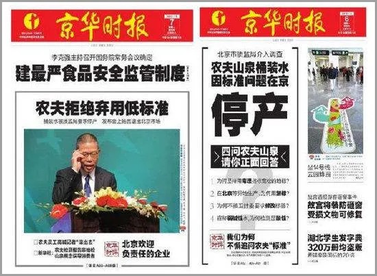 但水战并不是一帆风顺的。2013年,《京华时报》针对农夫山泉的质量,创造了“一家媒体批评一个企业”的记录:27天时间,67个版面,78篇报道……试图坐实农夫山泉“标准不如自来水”这一观点。