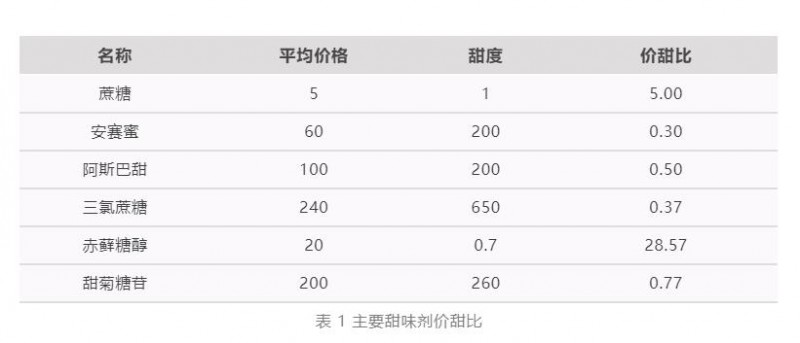 而赤藓糖醇的价甜比(同等甜度所需甜味剂的价格)是高于其余甜味剂的(表 1),当元气森林要求更高的市场溢价时,它也提供了对等的价值增量,消费者愿意为这部分健康溢价进行付费。