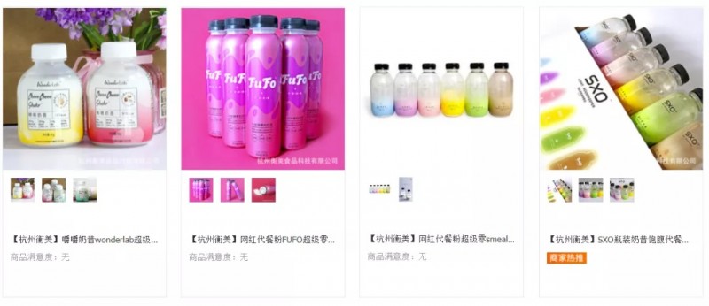 代系食品中绝大部分品牌会选择业内较为成熟的代工厂进行代工,由于其供应链集中,产品生产效率高,在产品冷启动金额不高的情况下,可以快速投入市场。但是,同一代工厂的产品差异化极低,以大单品代餐奶昔为例,我们查阅了杭州衡美的阿里巴巴售卖页,可以看见非常多的眼熟品牌。