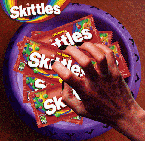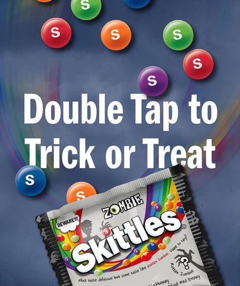 把大众气氛以及社交网络推向高潮的,还有今年万圣节推出的僵尸彩虹糖(Skittles Zombie)。