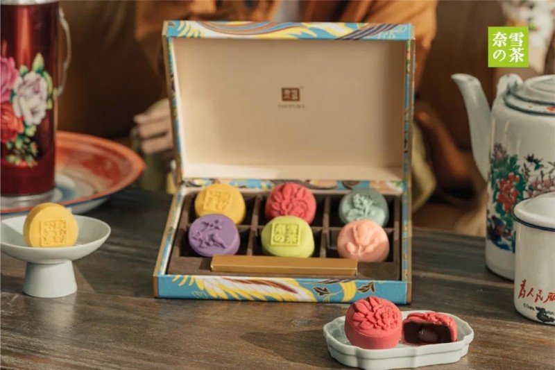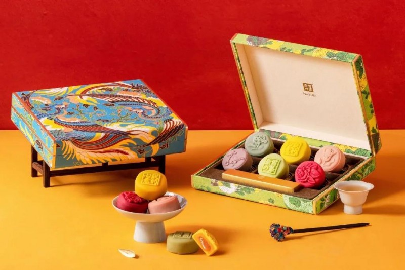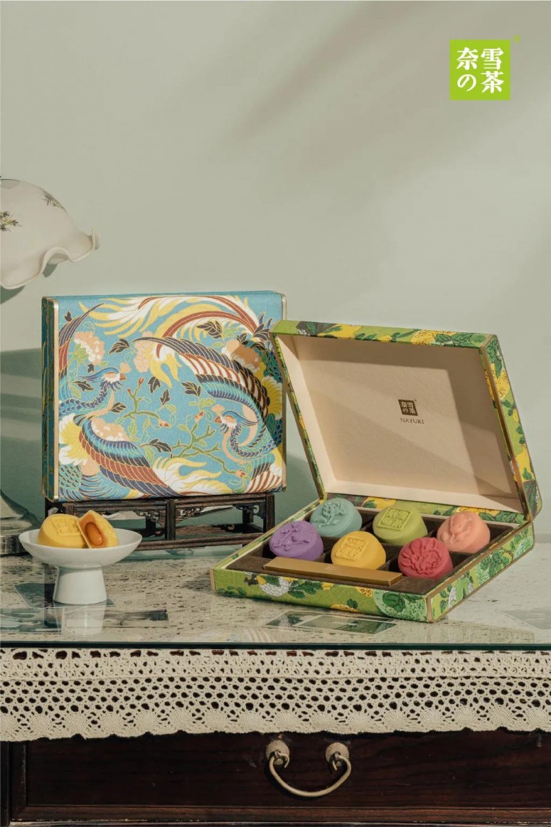 奈雪联合「朕的心意」,从文物中汲取灵感,推出「芳盒·丹若着锦」、「芳盒·凤凰翙huì羽」两款月饼礼盒。月饼礼盒分为6个不同口味和颜色,礼盒外包装是精致的凤凰图案。