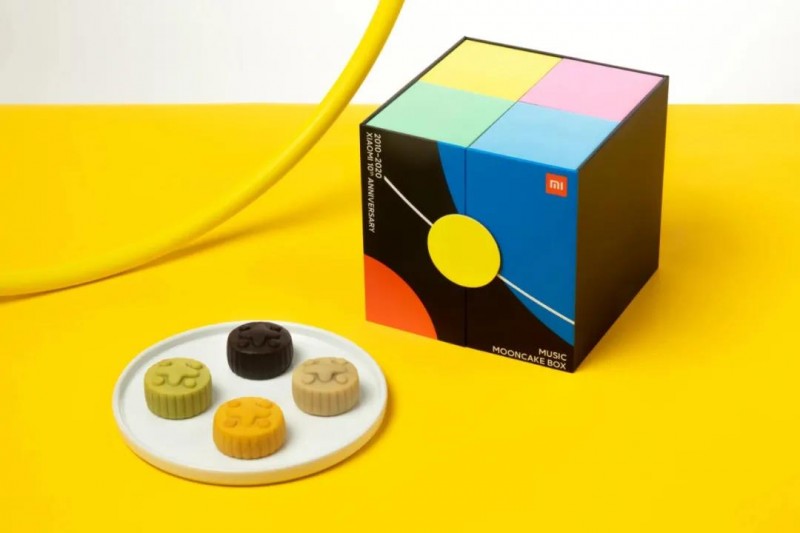 十周年中秋月饼礼盒,包装采用亮眼的马克龙色,给人眼前一亮的效果,同时月饼上印有“米”字。