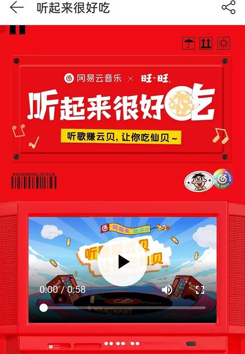 此次旺旺和网易云以“听起来很好吃”为主题,让你边听歌赚云贝,还能吃仙贝。