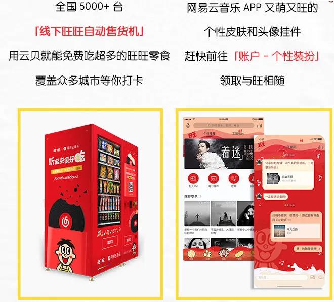 通过鼓励用户上网易云听歌赚云贝,并用云贝兑换零食,不仅能为网易云APP引流,增强用户粘性,同时也能为旺旺的5000台线下自动售货机引流。