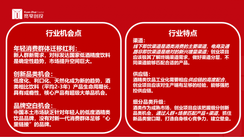 3.细分品类升级:酒类作为成熟市场,创业项目应该把握细分创新品类机会,通过人群+场景匹配产品+渠道,抓住新品类窗口期,打造自身核心竞争力,建立壁垒。