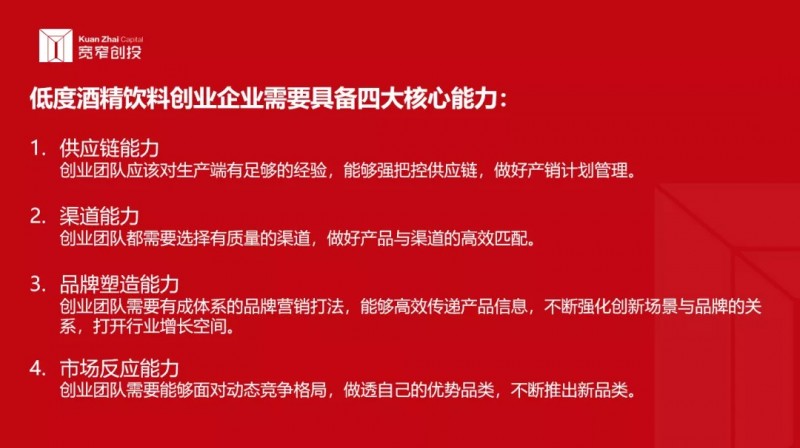 面对如此“美好”的新兴低酒精度饮料市场,创业企业一定要有“敬畏心”,做好人群+场景匹配产品+渠道的核心本质,无论是满足社交需求从线下即饮渠道切入,还是满足放松需求从新兴渠道切入,都需要创业企业一定要具备四大核心能力: