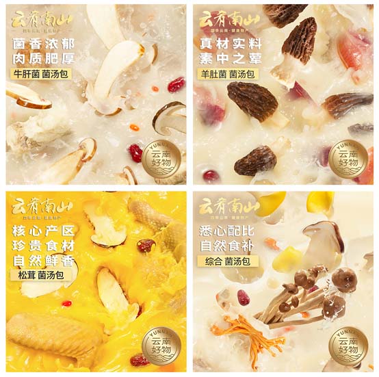 云肴南山菌汤包共有四款,将精心挑选的野生菌烘干并采用真空包装,最大程度保留菌子的新鲜和香味,同时方便储存、运输,让消费者不论身处何处、不论四季哪个季节,真正实现菌子自由。开袋后浸泡30分钟,让菌菇充分吸收水分膨胀,随后淘洗两遍,就可搭配排骨、鸡肉、火腿等一同煲汤,在家即可享受云南山珍美味。