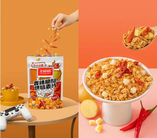王饱饱的有点闲系列咸味麦片在“健康高纤”的核心基础上,首次将麦片引入休闲零食场景,研发出辣味、咖喱味、肉松味三款极具味觉冲击的产品:香辣脆脆以辣椒粉裹麦片,搭配贵州辣椒脆和“薯都”土豆丁,辣味脆爽;日式咖喱以咖喱粉搭配土豆和秋葵,极具异域风情;肉松控以咸香肉松搭配海苔和玉米,口感独特。
