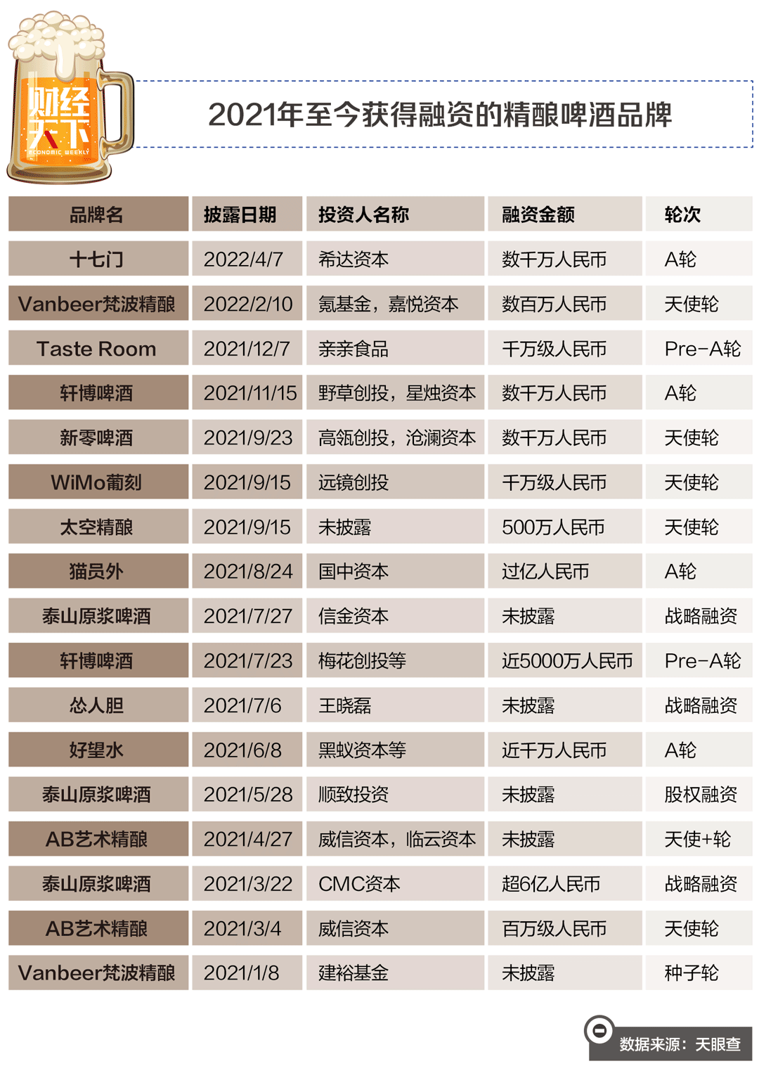 早在2016-2017年左右,这个领域里就已经诞生了诸如拳击猫、斑马精酿、猴子精酿、酒花儿等依托资本起家的“高端玩家”。在去年就有数十亿元融资灌进了精酿圈,轩博啤酒、新零啤酒、泰山原浆啤酒等精酿品牌分别在去年获得了大额融资,海伦斯、猫员外等连锁酒馆品牌也相继获得融资。天眼查向《财经天下》周刊提供的数据显示,从2021年至今有12家精酿品牌获得了融资。