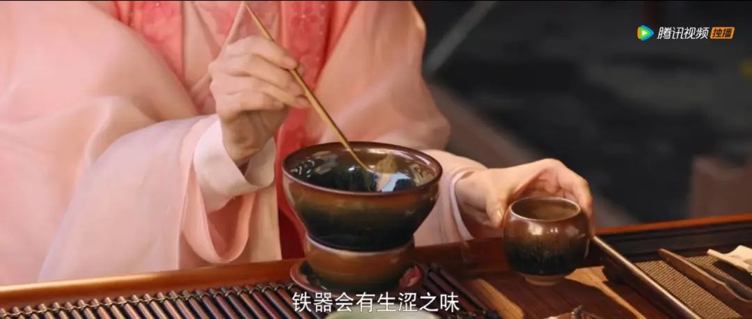 点茶击拂可以用到两种器具。和剧中仁宗同年代的著名茶人蔡襄告诉仁宗,击拂用的匙质地要重些才有力,黄金是最好的选择,百姓大多用银和铁。竹制太轻,冲点建茶时是不用的。