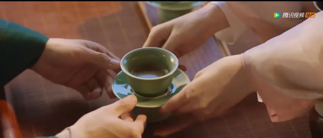 盏托相传是唐代蜀相崔宁之女觉得茶杯无托烫手,用碟子承着又容易倾倒,于是用蜡在碟子中间做了一个环将杯子固定住,于是成了盏托。到了宋代,大多数的盏托以木坯上大漆制成来配合建盏。也有许多像剧中一般盏与托同材质,如瓷、金、银等。有的人认为看古画时可以通过是否有托来判断人物喝的是茶还是酒,因为酒没有那么烫无需用托。但是剧中人物都是直接拿起杯子喝茶的,要托何用呢?