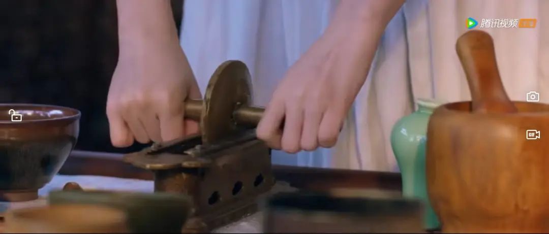 第1集中赵盼儿迫不得已重新备茶的第一步就是碾茶。用于碾茶的碾子形制和药碾一样,却要精致得多。材质上以银为上,熟铁次之。宋代点茶茶色以白为贵,现碾现点才能达到色白的效果,放久了色泽就会昏暗。