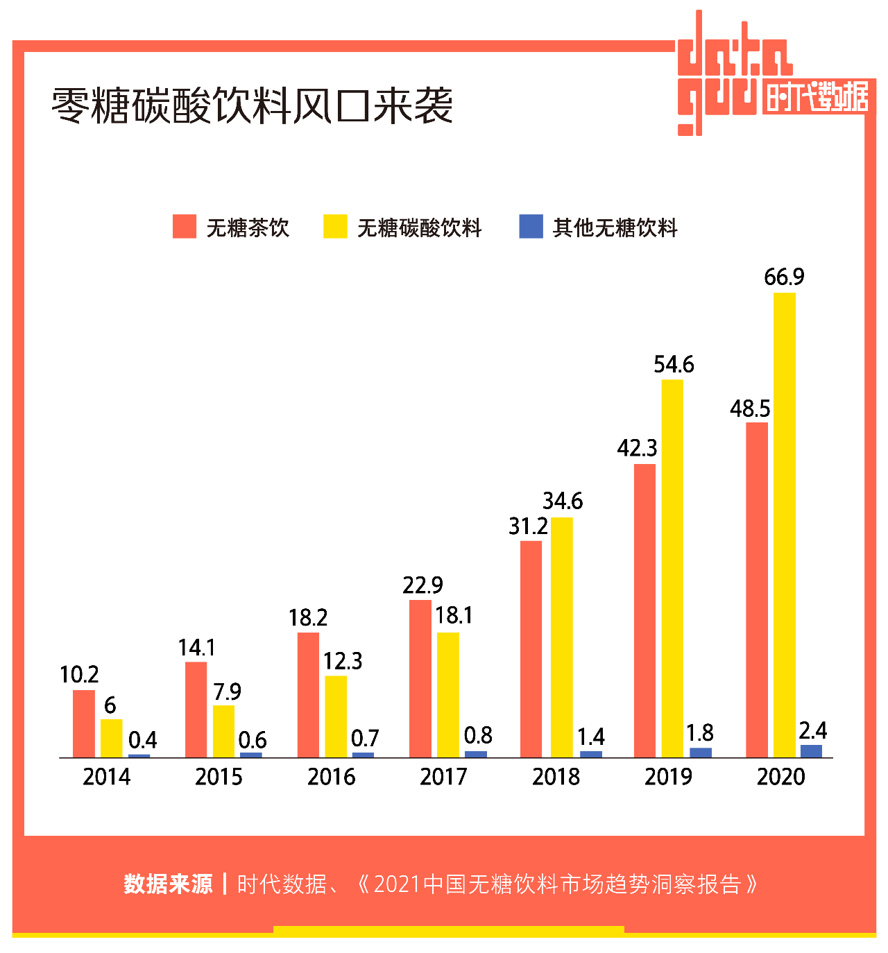 敏锐的元气森林直接将“0糖0卡0脂”写在饮料瓶身上,成为这波健康生活浪潮之下的最大赢家。元气森林的零糖气泡水于2018年3月面市,公开数据显示,2019年、2020年“618”期间,元气森林都取得了天猫饮品类销量第一的成绩,2020年元气森林业绩同比增长约270%,全年销量达30亿元,其中气泡水的销售占比超过70%。