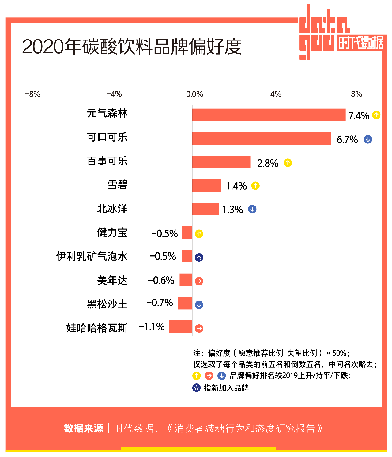 同时冠名几档热门综艺,在2020年《乘风破浪的姐姐》如火如荼的时候,请来最火姐姐张雨绮做品牌大使,电梯间、公车地铁广告铺天盖地,与过去几年间成功被贴上“网红”标签的新品牌类似,凭借着电商新渠道以及年轻人众多的新媒体渠道怒刷一波存在感后,元气森林彻底火了。2020年,益普索发布的报告显示,元气森林首次超越可口可乐,成为碳酸饮品中偏好度最高的品牌。