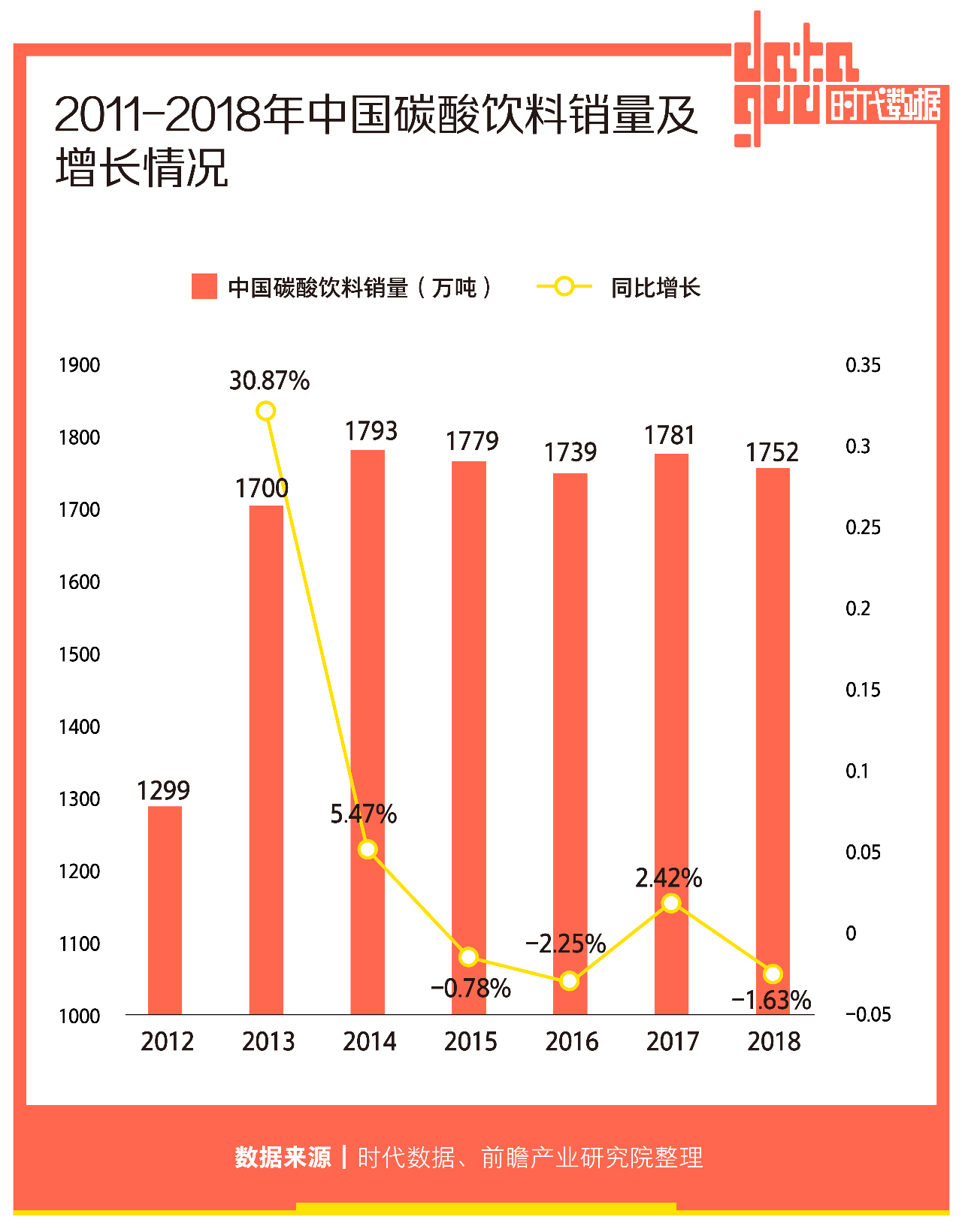 但如今这个市场不景气了。前瞻产业研究院的数据显示,2012年到2018年传统碳酸饮料销量的增速经历跳楼式下跌,一度出现负值。2019年全拓数据统计显示,碳酸饮料在软饮料行业中市场份额从曾经的前三下滑至第四位,占比为14.94%。
