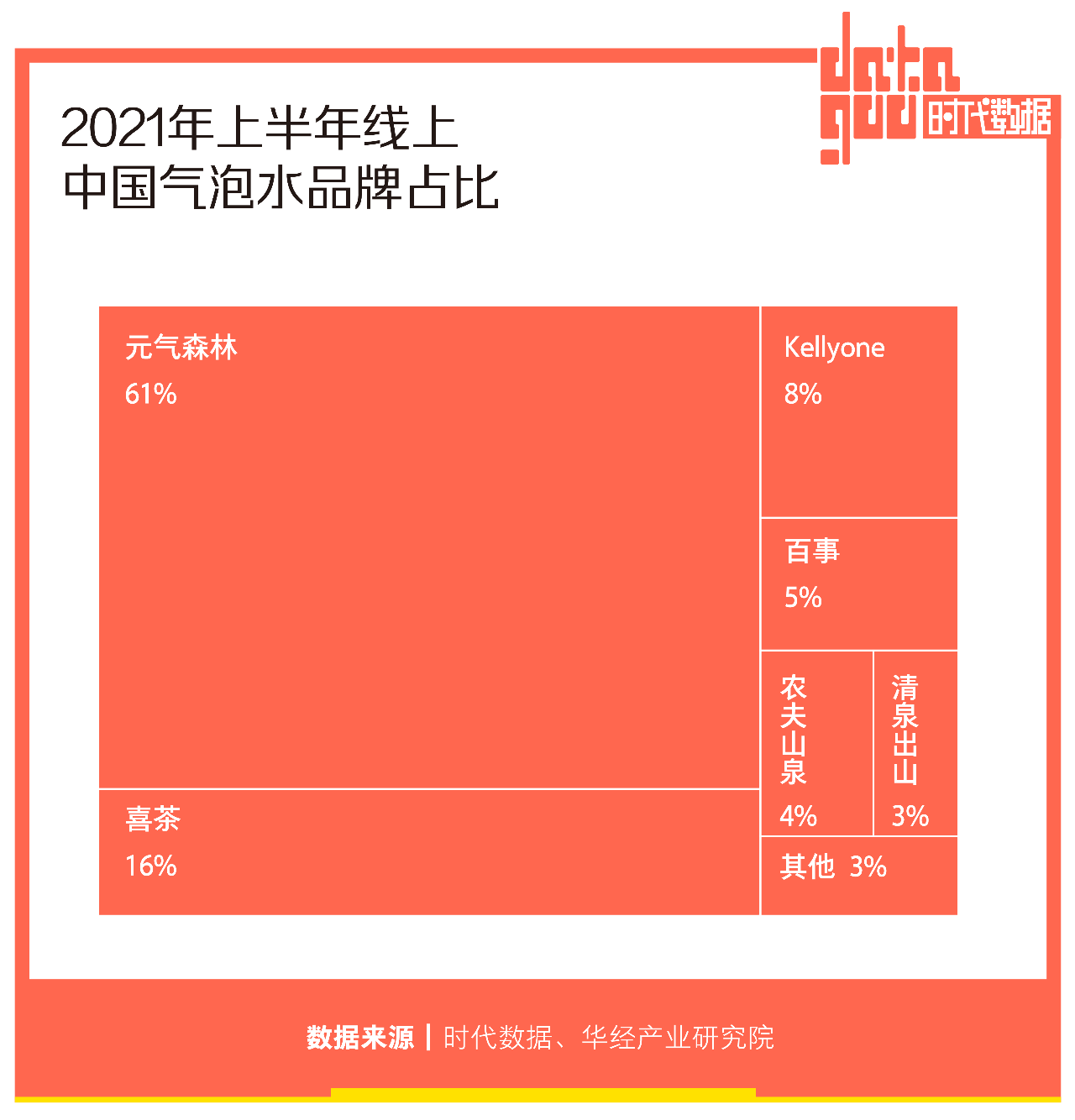 市场持续扩张下,气泡水市场格局正在改变。公开数据显示,2019年之前元气森林的市场占有率高达85%,但2020年竞争对手全部跟上来,华经产业研究院数据显示,2021H1线上气泡水品牌销售占比中,元气森林位列第一,占比高达61%。喜茶旗下的瓶装饮料,已在不知不觉中崛起,拿下了线上气泡水销售市场16%的份额。