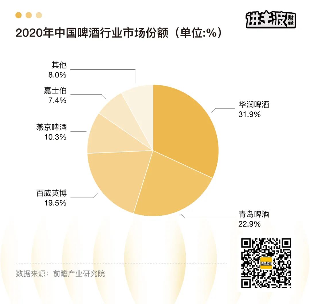 伴随中国啤酒产量增长的,还有不少“大鱼吃小鱼”式的吞并、收购、重组事件,数以百计的地方啤酒品牌消失在人们的视线和生活中。如今的中国啤酒市场已是华润雪花、青岛、百威英博、燕京和嘉士伯“五强争霸”的局面,2020年市场份额占比为华润31.9%、青岛22.9%、百威英博、19.5%、燕京10.3%、嘉士伯7.4%。