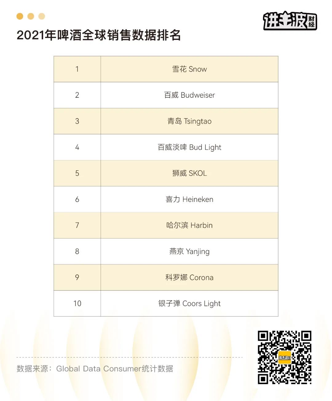 根据各家啤酒公司的全球销售数据,Global Data Consumer统计得出了的2021年销量排行榜,全世界销量排名第一的是来自中国的华润雪花,2021年整体啤酒销量约1105.6万千升。
