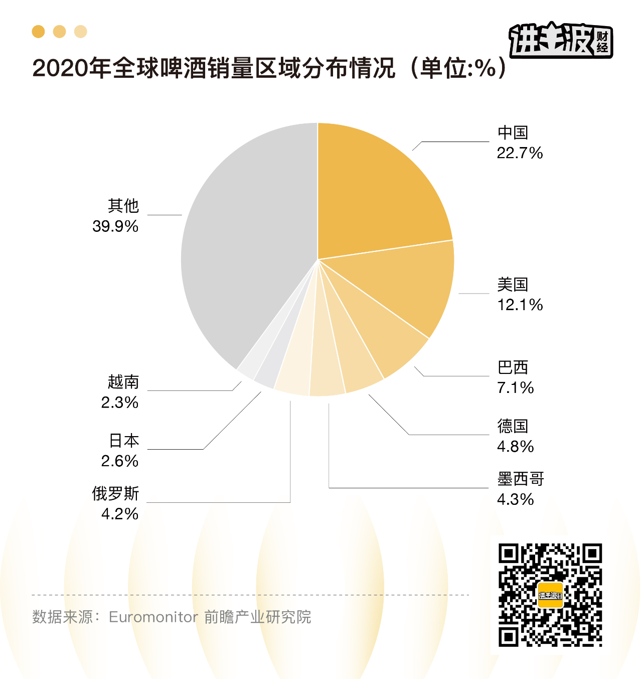 从全球啤酒消费分布来看,我国是世界上最大的啤酒市场。2020年,全球啤酒销量达18769.8万千升,其中中国啤酒销量为4269.4万千升,占全球啤酒销量的22.7%,为全球最大的啤酒消费国家。