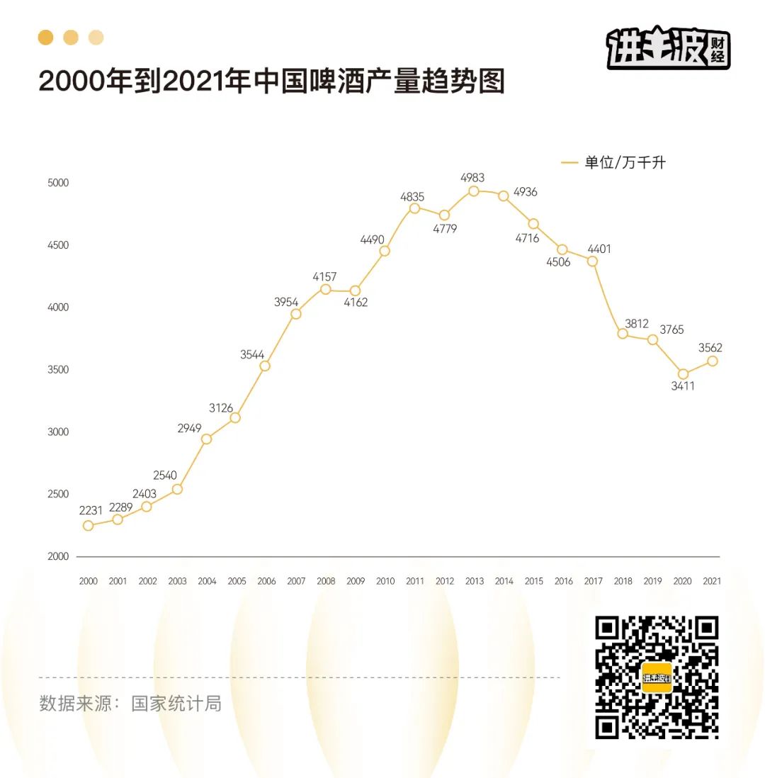中国啤酒产量从2000年的2231万千升一路增长到2013年的4983万千升,在这13年时间里,增幅达123.35%,期间仅2012年出现过一次下滑。从2014年起,啤酒产量进入下降通道,一路从2013年的4983万千升下滑到2021年的3562万千升,总跌幅达28.5%。2021年回落到3562万千升,基本相当于2006年的水平。