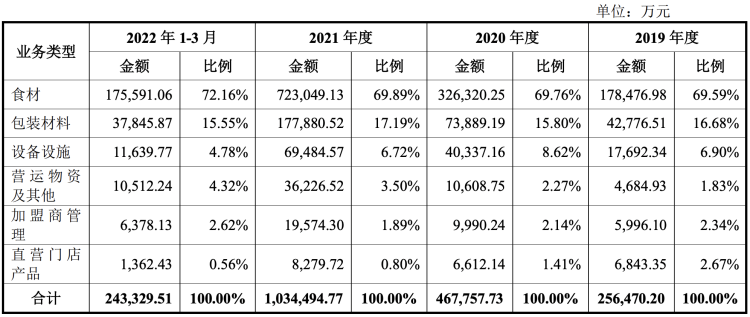 也就是说,食材、包装材料、设备设施、营运物资及其他、加盟商管理,以及直营门店产品,构成了蜜雪冰城的主营业务。