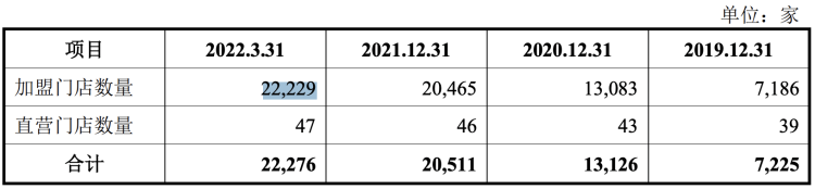 人们还关心蜜雪冰城究竟开了多少店。招股书显示,截至一季度末,蜜雪冰城共有加盟门店22229家、直营门店47家,门店数量已位居国内现制茶饮行业第一。对比来看,2014年时其门店数量还只有1000家,2018年突破5000家,2020年突破1万家。