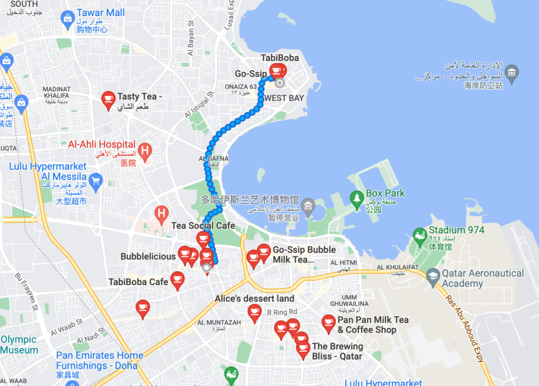 Tabi Boba丸作食茶和 Go-Sip Doha,几乎是多哈规模最大的两家本土珍珠奶茶连锁。Tabi Boba丸作食茶在多哈的门店就高达4家。