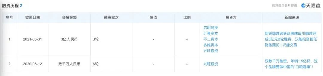 消费市场见长的隅田川,在资本市场亦逐渐被熟知。截至目前,隅田川咖啡已经分别在2020年8月、2021年3月完成两轮融资。其中,B轮融资交易金额高达3亿元,该轮融资由启明创投和沂景资本联合领投,不二资本、多维资本跟投,A轮领投方兴旺投资在本轮继续追加投资。