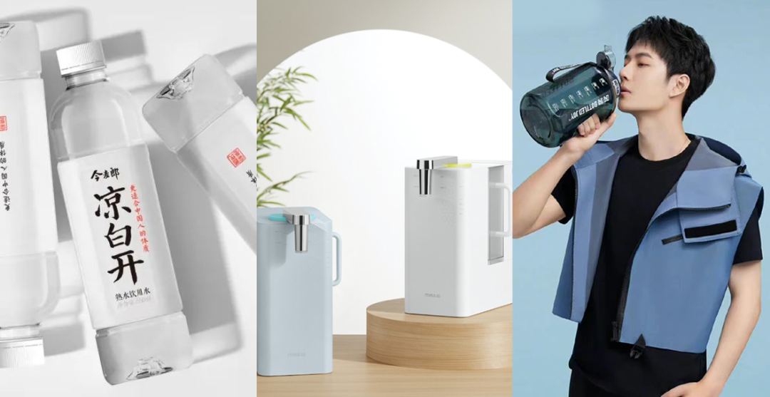 从左到右分别为今麦郎熟水产品、新式水家电和王一博代言吨吨桶