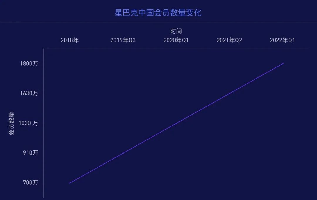 根据星巴克2018年5月提供的数据,90天内活跃会员的人数增加到了近700万人,此后逐年增长,到2022年已经有1800万会员。