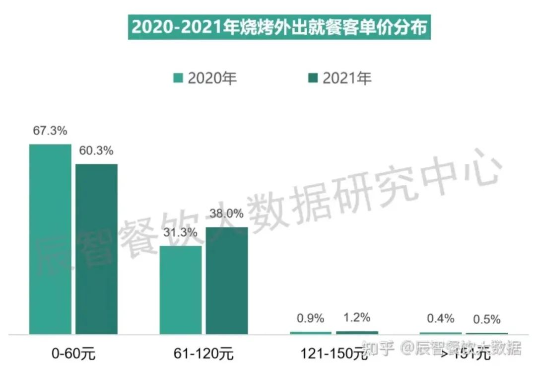 根据辰智餐饮大数据研究中心最新发布的《2022烧烤大数据分析报告》显示,烧烤店人均消费约60%分布在60元及以内,属于中低消费,因此,人均消费不过百是主流。而且尽管61-120元区间的占比正在增加,可依旧与0-60元区间的占比相差较大。