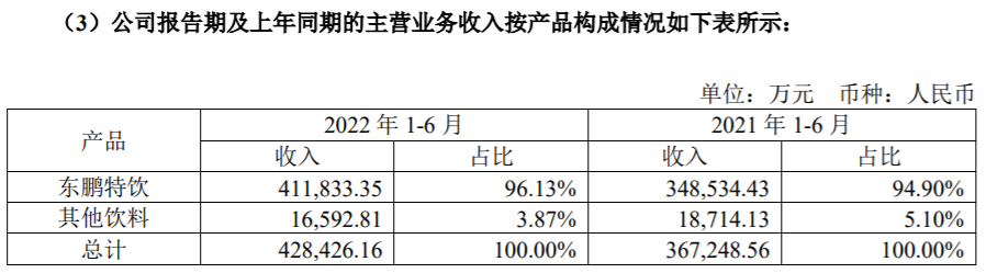 另外,虽说“渠道全国化”的战略正有条不紊地推进中,但是不同地区的营收不均衡,也是影响东鹏饮料继续保持高增长态势的主要原因之一。根据半年报数据,消费能力相对较强的华东地区上半年营收为5.647亿元,营收占比为13.16%。而一个广西地区的营收就达到了4.798亿元,占比11.18%。为此,网友曾在投资者互动平台进行过问询,“为何广西一个省的业绩与华东地区相近?”东鹏饮料给出的答案是“广西市场开发较早,且广西有着庞大的消费基础”。上文提到,模仿棋是一把双刃剑,在完成红牛模式“复刻”之后,林木勤发现现阶段了现阶段东鹏饮料“资本新故事”的桎梏,过于依赖大单品。东鹏特饮这款不可撼动的大单品为东鹏饮料提供了超过九成的营业收入。半年报显示,东鹏特饮录得41.18亿元,同比增长18.16%,销售收入占比为96.13%,同比上升1.23%。
