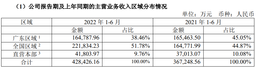 而对手红牛一直深陷品牌之争,也让市场对东鹏饮料的期待直线上升。2022年Q1财报显示,东鹏饮料录得20.07亿元,同比增长17.26%,增速与去年同期的83.37%相比有了明显的下滑。根据最新的第三季度财报显示,东鹏饮料的营收增速同比下滑近20%,利润增速下滑近25%。比营收增速下滑的更快的,是东鹏饮料的股价。上市一年不到,2022年5月10日,东鹏饮料的股价就迎来了111.35元每股的最低点,相比于去年7月282.7元每股的最高点,股价跌超60%。东鹏饮料的营收增速放缓,与宏观经济不景气有关,但更重要的,还是在于其渠道建设的南北失衡。上市前,林木勤曾说过,只有当广东地区的营收占比降到30%以下时,东鹏饮料才能算是“真正的全国品牌”。上市后,随着全国战略的逐步推进,东鹏饮料除广东以外区域的营收增速与占比出现了明显改观:去年中报显示,除去广东地区全国销售额占比为44.87%,而这一数据在今年上半年变成了51.78%,营收占比首次超过五成。具体到区域来看,营收增速也大致符合林木勤的期待值:华东区域实现销售收入5.65 亿元,同比增长46.38%;西南区域实现销售收入3.29亿元,同比增长45.06%;华北区域实现销售收入2.95亿元,同比增长63.20%;中区域实现销售收入5.50亿元,同比增长27.15%。可是,“外患”在一步步排解的同时,“内忧”却悄无声息地发生了。根据中报,东鹏饮料广东地区的营收占比虽然降到了38.4%,但一起下降的还有营业收入,为16.48亿元,同比去年减少了700万元。