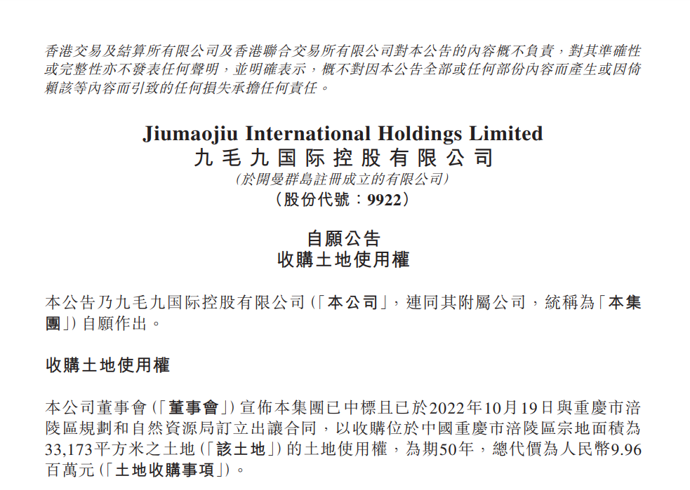 距离11亿元买办公楼计划被市场“劝退”不到一个月,九毛九集团再次打起了买地建厂计划。10月19日,九毛九集团再出公告披露,公告显示,集团已中标且已于2022年10月19日与重庆市涪陵区规划和自然资源局订立出让合同,以收购位于中国重庆市涪陵区宗地面积为33173平方米的土地的土地使用权,为期50年,总代价为996万元。