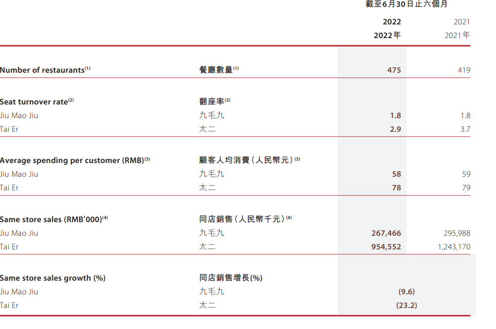 然而,这张九毛九分外倚重的头牌,如今也隐隐有了疲惫的迹象。年报显示,太二除了营收同步下滑之外,其翻台率也在持续降低,2018年至2021年,其翻台率分别为,4.9、4.8、3.8、3.4。而2022年的上半年,翻座率仅为2.9。