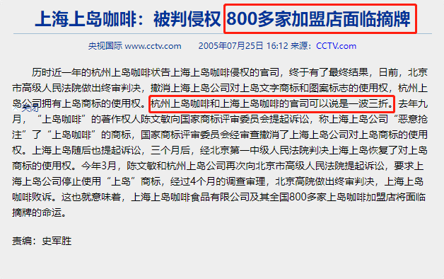 最后,上海上岛咖啡败诉,上海上岛咖啡旗下的加盟店面临要么关店,要么投靠杭州上岛咖啡的困境。