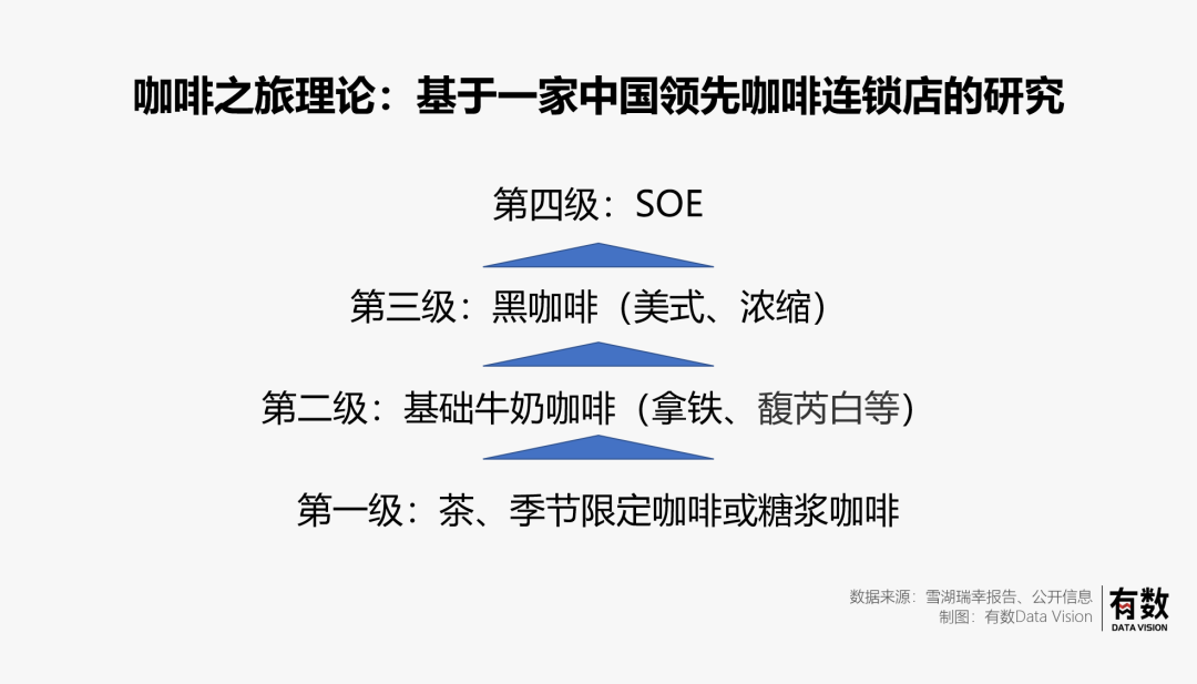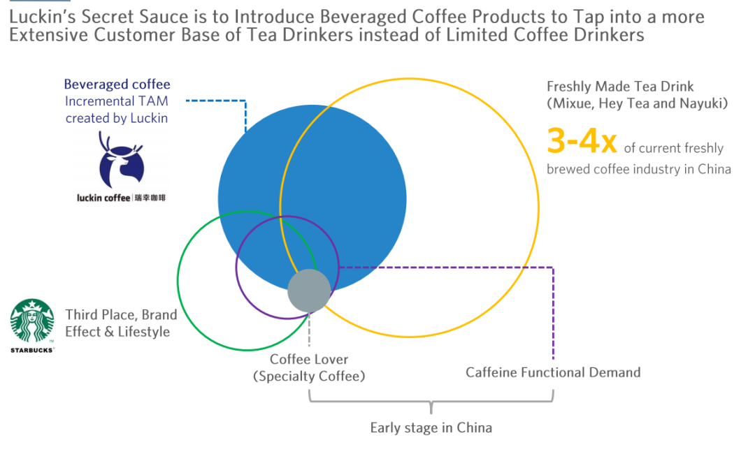 决定瑞幸天花板的是咖啡市场规模,雪湖认为咖啡市场比茶饮市场小不是因为喝咖啡的人少,而是因为咖啡店少。近几年,咖啡市场的规模扩大主因,是咖啡门店数量的增长提升了普及率和触达率。其次,具有中国特色的咖啡饮料化会打开咖啡的天花板,例如生椰拿铁。同时雪湖认为这是瑞幸这种中国本土咖啡的特长,星巴克难以实现这类SKU的创新。威士忌:尽管亚洲国家对于纯的威士忌接受程度不高,但是威士忌搭配上苏打水之后,日本人均年威士忌消费量从1974年的1.8升提升到了1984年的3.3升。苦味啤酒:白爪推出新口味的苏打酒降低了酒精度数,并占领了市场。烈酒野格:烈酒野格经过饮料化口味改良(更适合兑红牛了),1974-2000年销售额增加了2167倍。这张图代表瑞幸的市场可以通过饮料式咖啡向黄圈进军