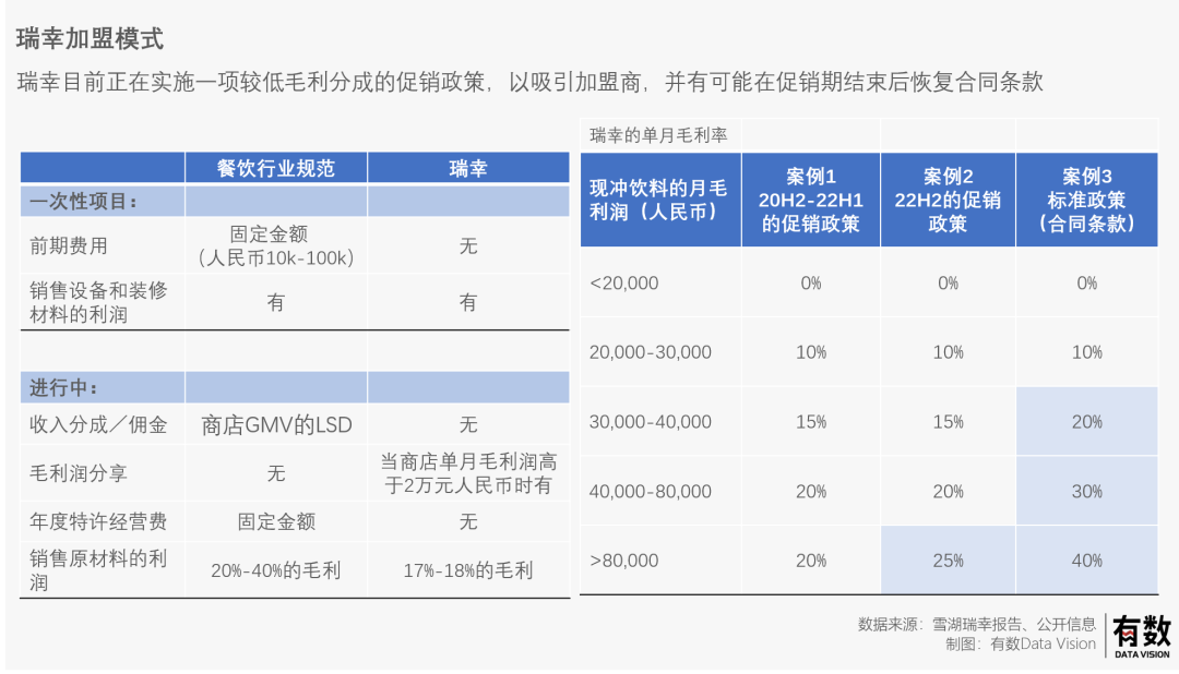 对于这个观点,雪湖认为瑞幸处于中国咖啡市场价格带的中下游,因此有在下沉市场开店的潜力。同时下沉市场地域广袤,有更多的开店空间。按照雪湖的测算,如果对标蜜雪冰城的门店密度,瑞幸咖啡在下沉市场的门店数量可达到7428家门店(当前2203家)。在高线市场则对标星巴克的门店密度,预计未来可达到6696家门店(当前5185家)。观点四:加盟