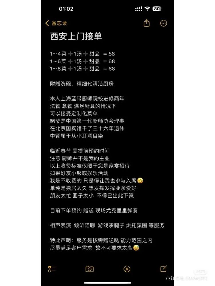 从小学开始,父母忙于工作,朵草便学会了自己做饭养活自己,至今练就了一手好厨艺。除了练手艺,她还在学水彩、绘画、摄影,技多不压身。在全国各地流浪的柘似乎是最早在网上发布上门做饭消息的人。2020年左右,网上开始出现了各种出售个人技能的服务,例如陪聊、情感咨询等等,他便也开始琢磨起自己有什么技能可以出售的。因为他总是和朋友聚餐,五六个人的饭,都是他做的,朋友的评价也都不错,于是他在闲鱼上发布了一条上门做饭的广告。第一单便是个招待客人聚餐的单子,要做12个菜,那顿饭做了很久,不过最后客户还向朋友们郑重介绍了厨师,让自己觉得挺有成就感。这些年来,他陆陆续续接待了不同的单子,有的顾客很有耐心,跟他一起去买菜,等到做完饭中午饭都吃到下午四点了。还有一次,一位“心很大”的客户直接把房间密码告诉了他。直到最近几个月,他发现网上越来越多人开始发布上门代厨的文案,有的价格甚至低到58元一餐。甚至有人亮出上海蓝带厨师的招牌,“姥爷是中国厨师协会的理事”,上门做饭还包清洁厨房,聚会餐甚至不收钱,甚至附赠尤克里里弹奏业务,只图一起吃个饭,拓展社交圈子。