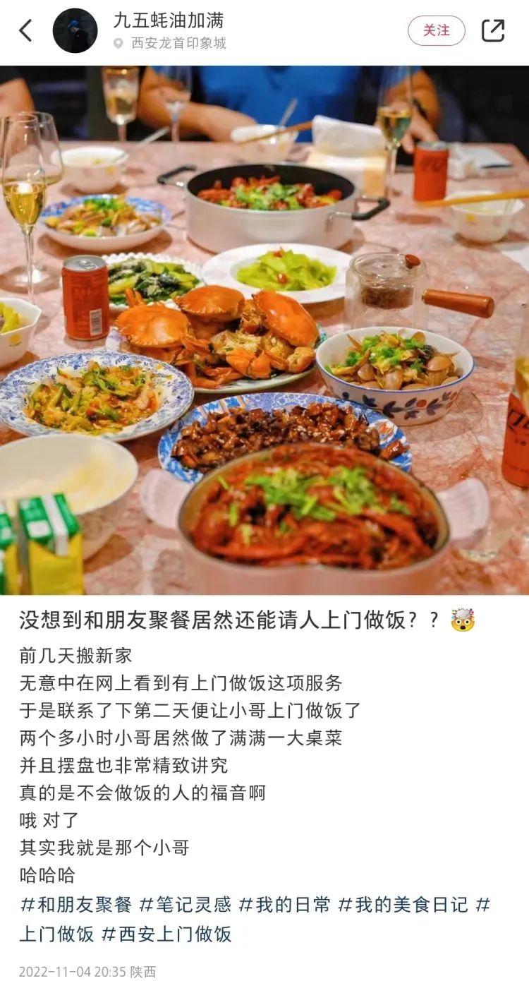 下午五点,脱下咖啡师的工作制服,走出咖啡店,华帅急匆匆赶赴她今天的第二份工作。在路上,她在脑海里盘算着稍后要打交道的鱼鱼虾虾——一会儿,她要用那些食材,给刚认识不久的客户做一顿晚餐。几个月前,华帅开始接上门做饭的单子,三菜一汤,80元,这成了她下班后搞点副业的小小尝试。这两年来,小红书等平台上出现了越来越多像华帅这样的人,他们日常喜欢做饭,也无意间发掘了私厨上门的需求。外卖越来越难吃,外面的餐厅吃来吃去价格贵又重油,馋那一口“家里做饭的味道”的年轻人,对请人来做饭跃跃欲试,看着别人做饭眼馋,自己终于也可以用不多的价格拥有自己的上门私厨。瞅准了这样的商机,成都女孩张要红甚至找到了四十几位业余厨师,创办了“干饭集团”公司。而在京东平台上,甚至推出了“51厨师”专业厨师团队上门服务,只不过,一顿5-8人餐,做饭的费用是500元起。