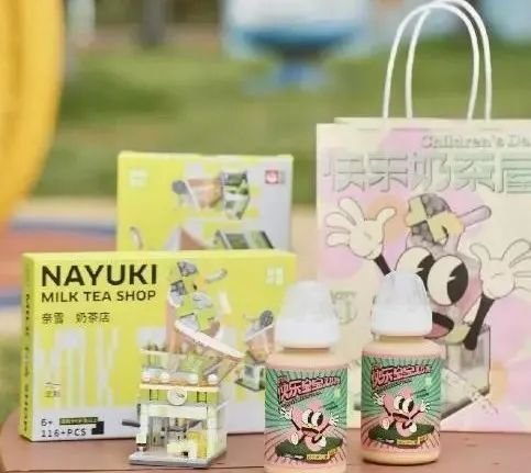 今年6月份,奈雪的茶也推出了超值快乐宝宝套餐,内含一瓶定制 “宝宝奶瓶”包装“快乐宝宝奶茶”和一套定制潮玩积木“奈雪奶茶店”。