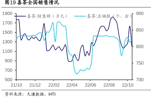 这种谨慎扩张姿态并无太大意外,对于走直营路线、门店密度分布北上广深及新一线城市的喜茶来说,疫情影响显著。根据久谦中台数据显示,喜茶销售额今年以来持续走低,并在四月份触及低点,此后在震荡中反弹,但10月份营收整体仅略高于去年12月水平。