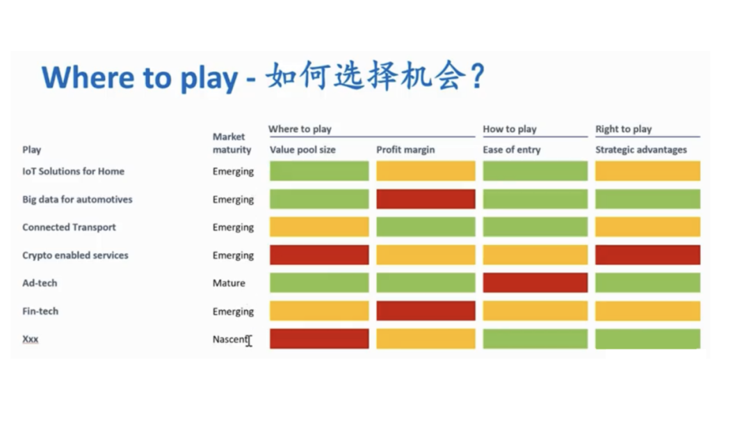 当你的机会列举出来之后,再根据这个框架列举一个图表,就会很清楚知道目前这个市场是属于成熟还是成长中,亦或是初期的市场。Value pool size 就是在哪里投资,整个市场价值的营收是多大的,绿色表示很大,黄色表示小,红色表示非常小。然后再看profit margin ,也就是这个领域是否赚钱,