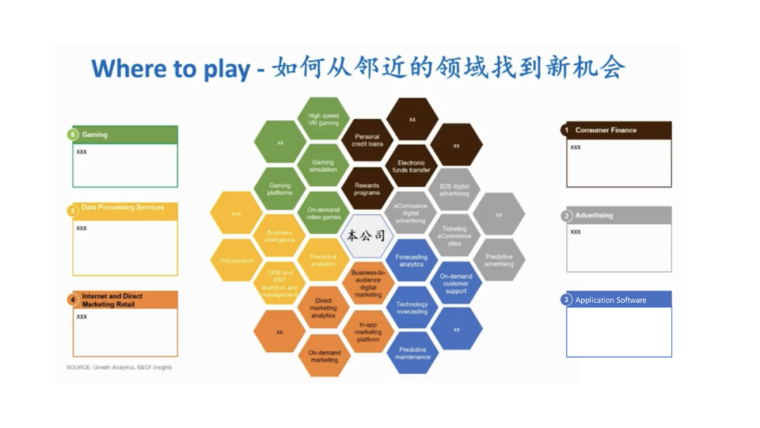 比如你邻近的业务是消费金融、电子游戏、游戏平台、VR游戏、数字广告、企业营销等,那这是对于一家科技公司而言的,对于你的公司来说,哪些领域是与目前核心业务相邻近的,你需要在这个框架中按照距离比重将最邻近的、次邻近的、外围业务展示出来,这些业务都是你可以进行拓展的;